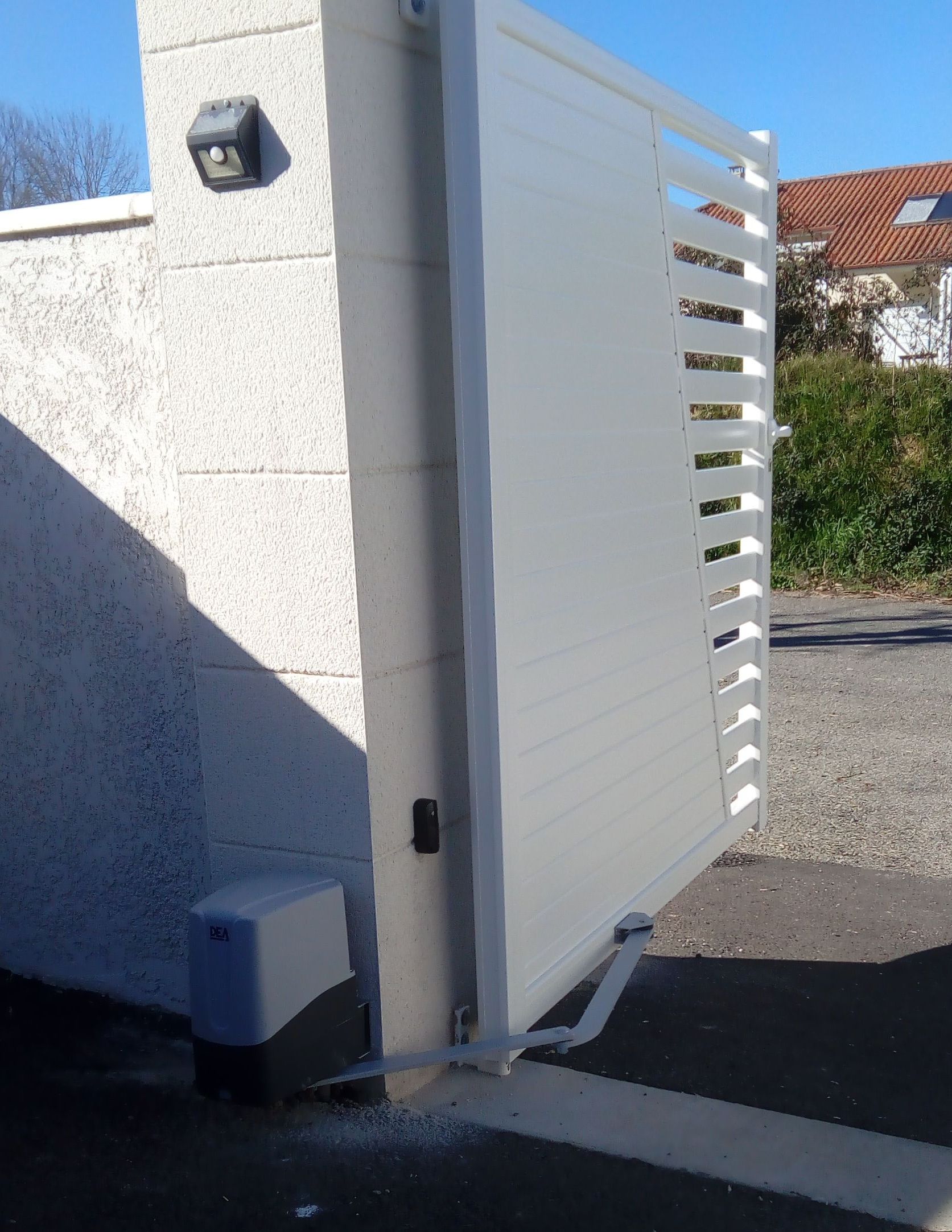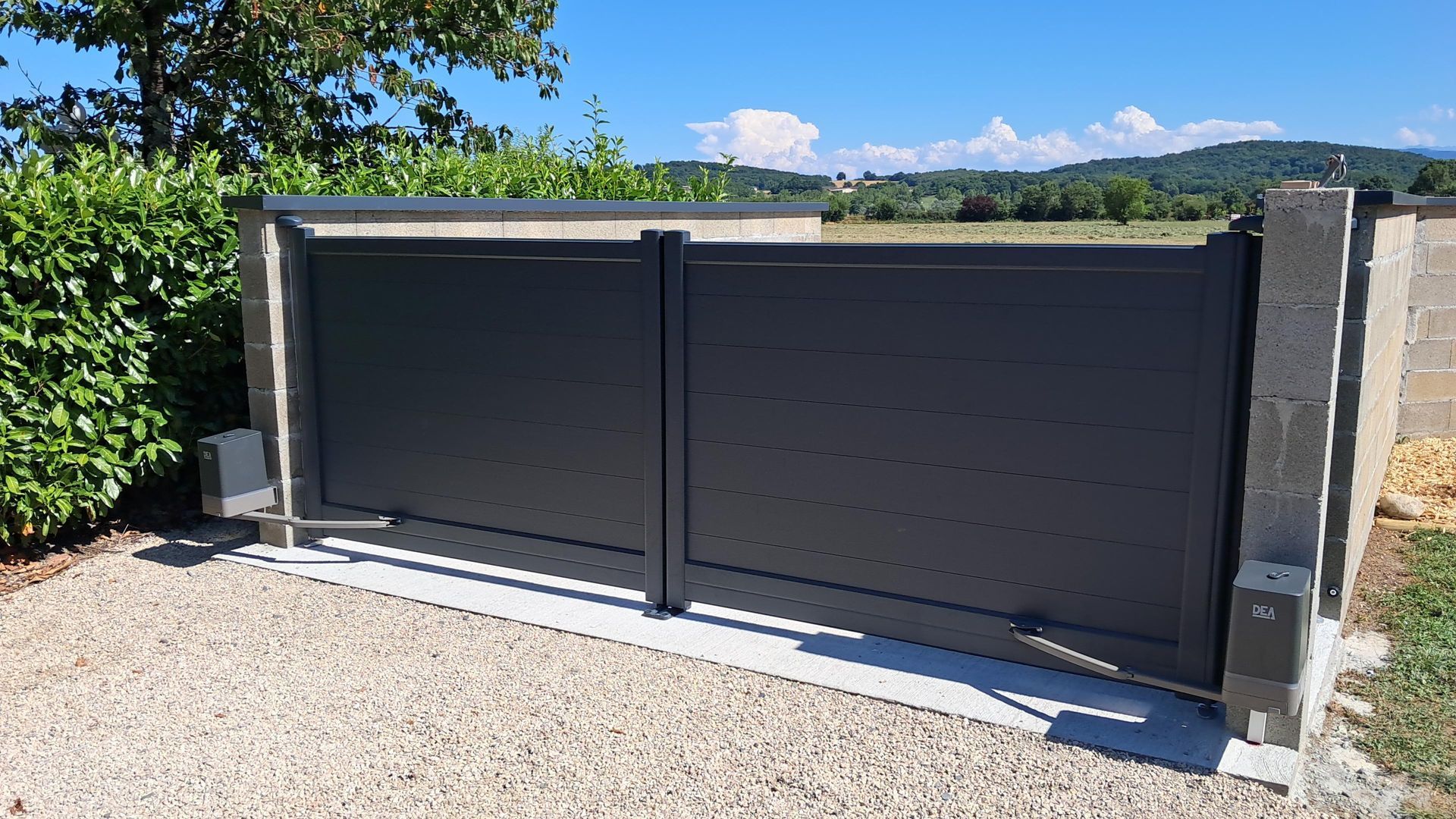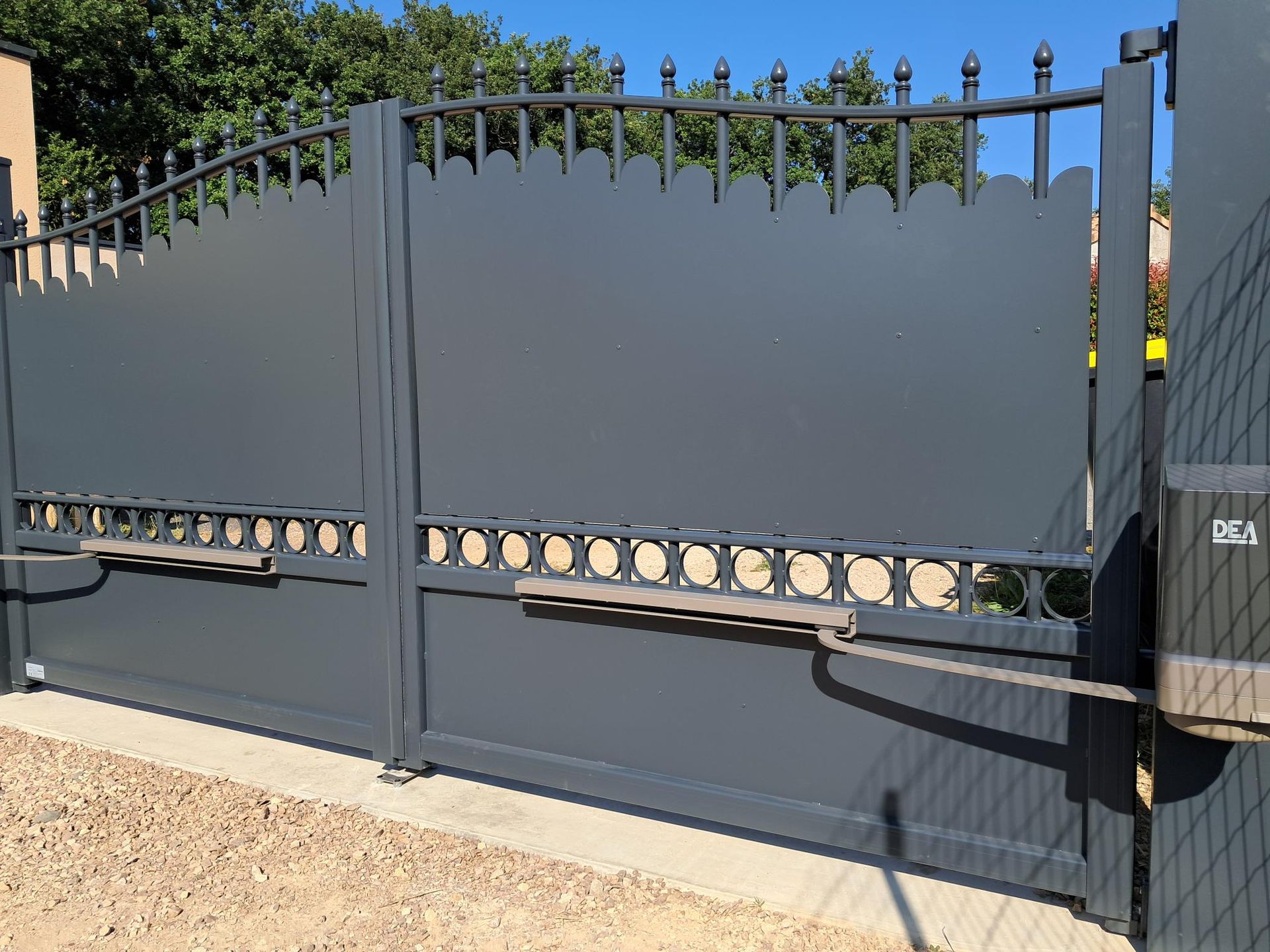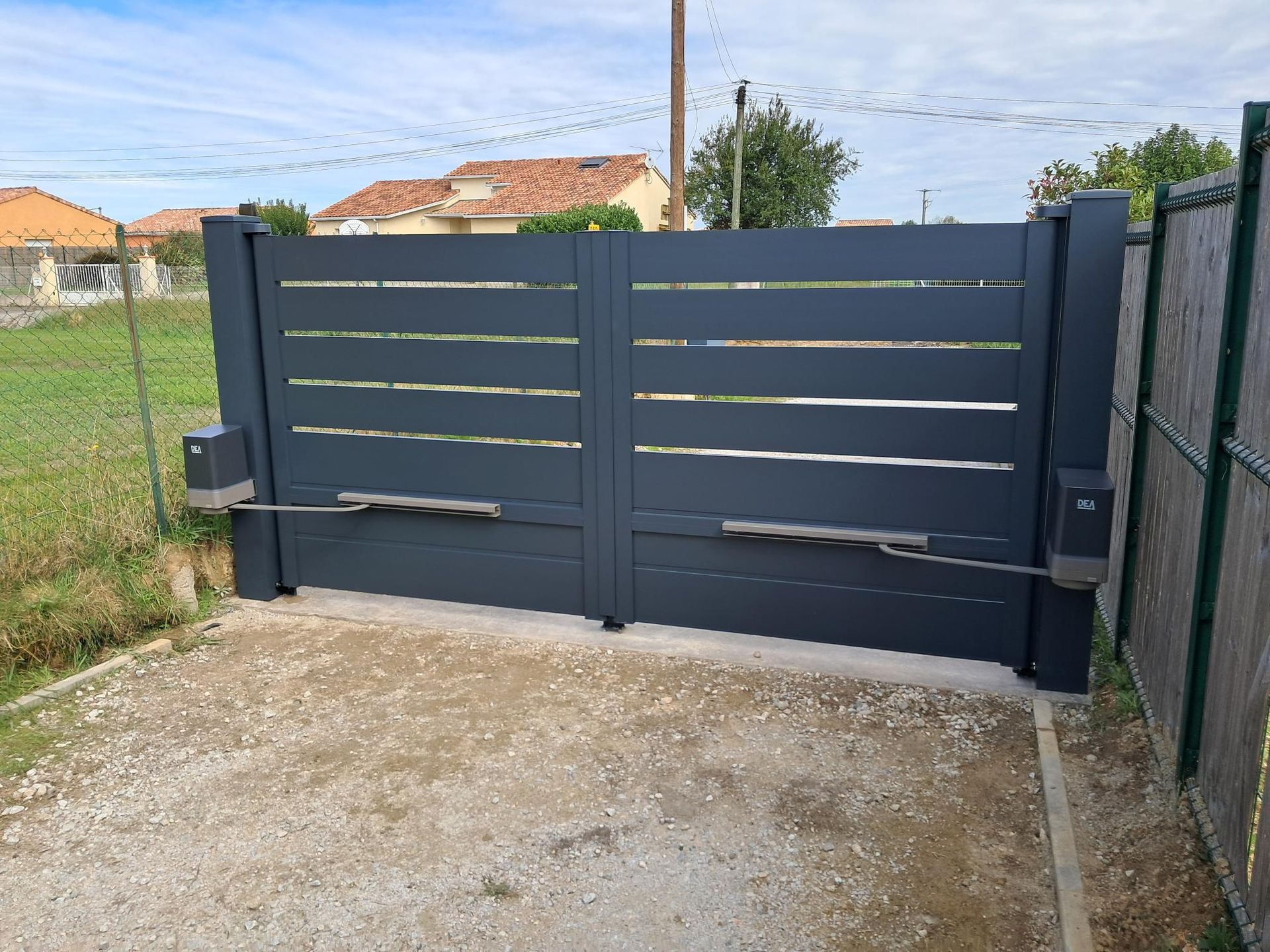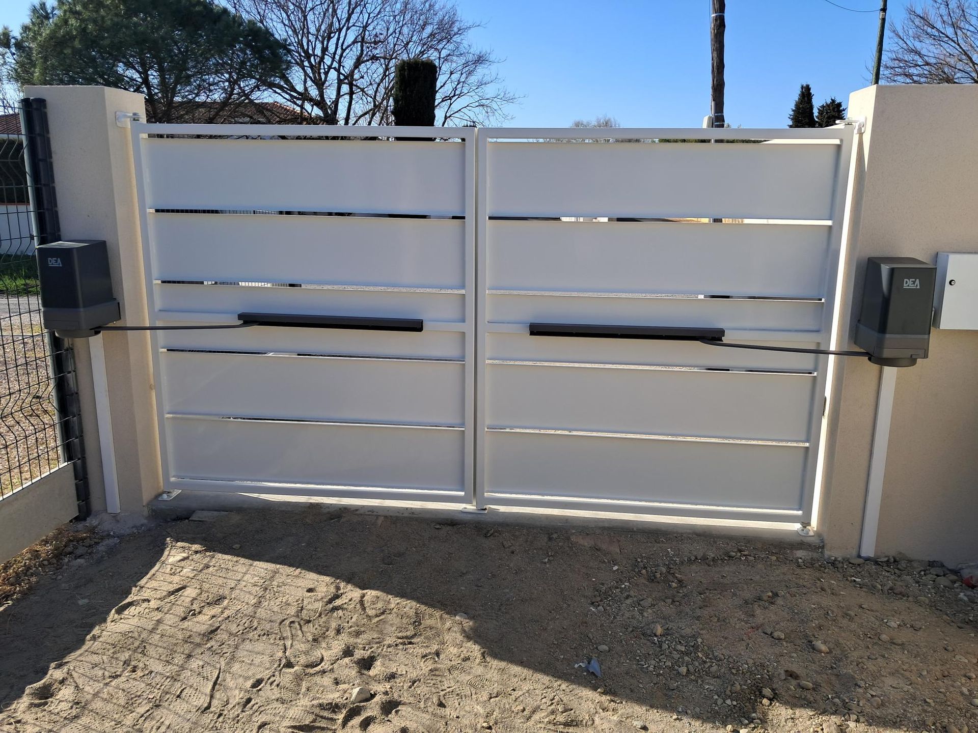Portail aluminium 2 vantaux -Motorisation DEA avec bras longs pour ouverture vers l'extériure
