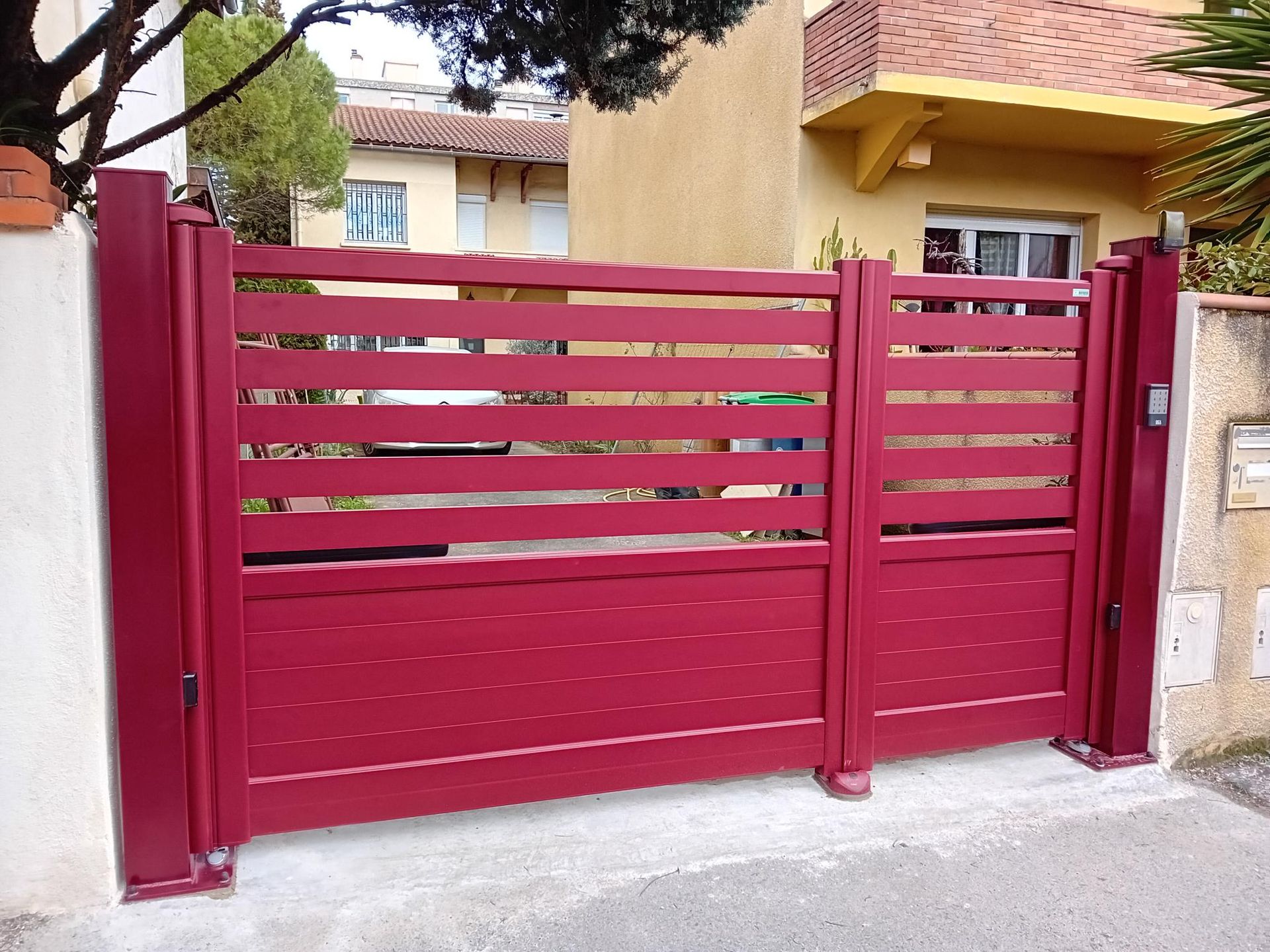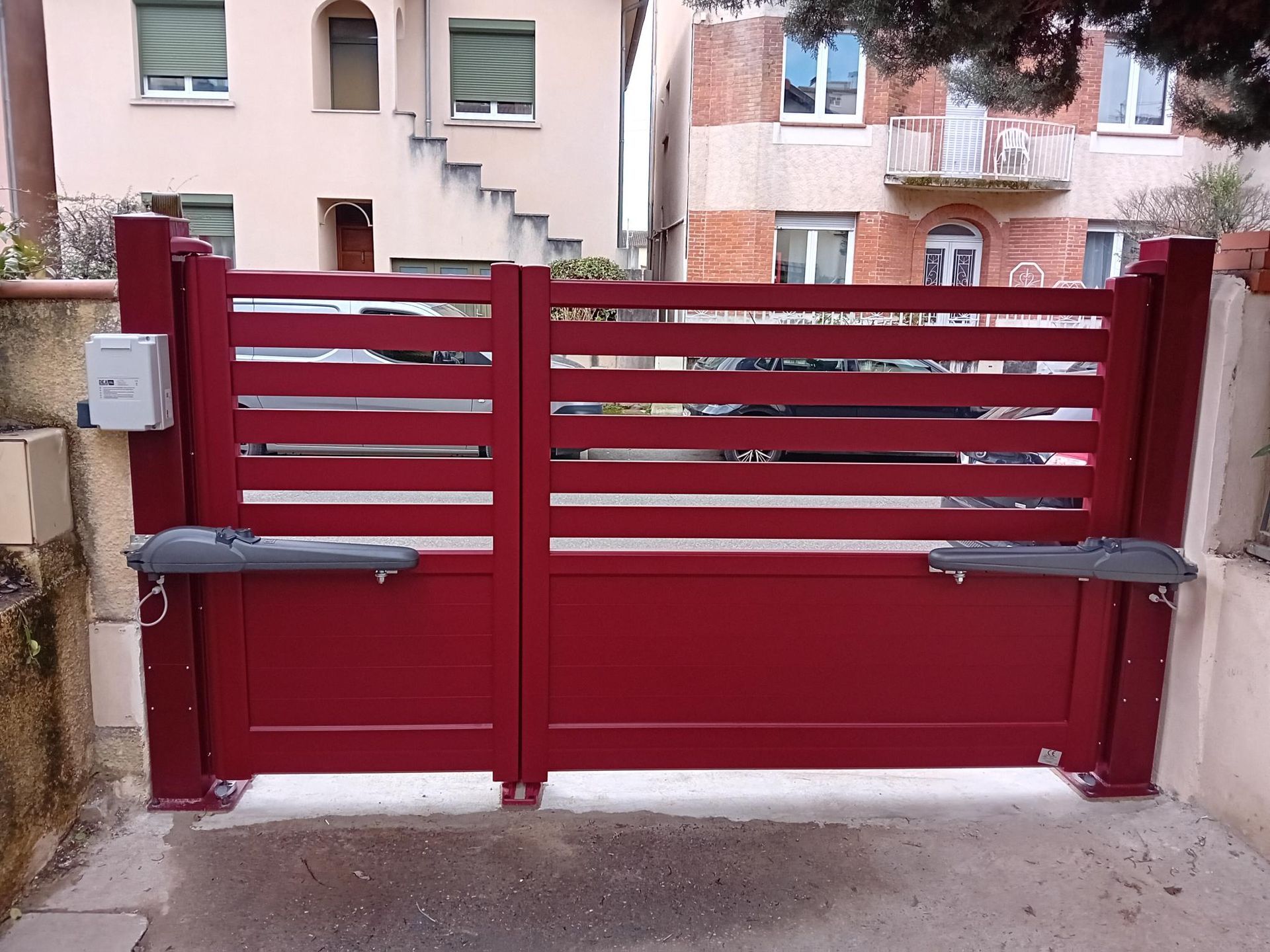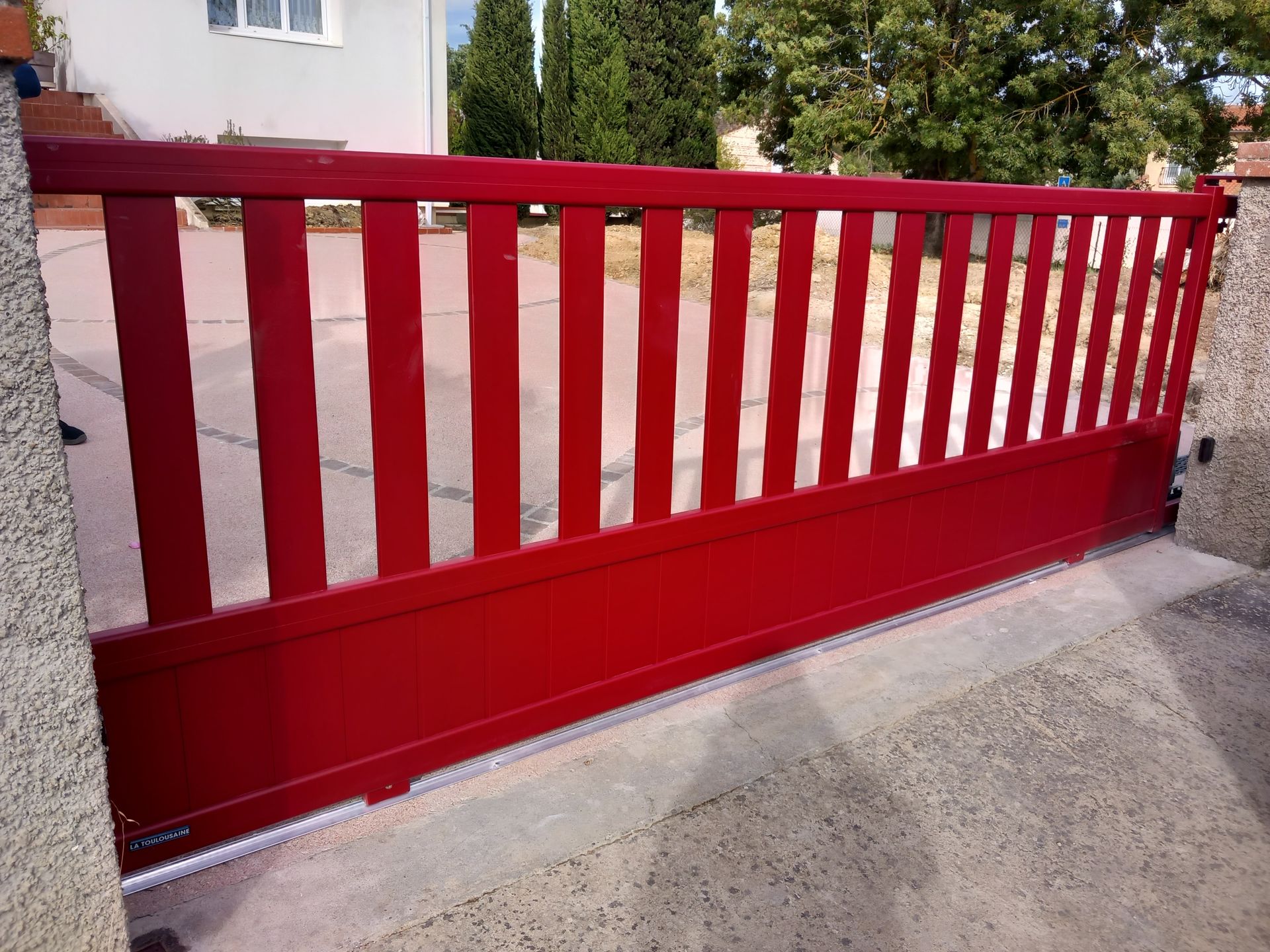 Portail aluminium motorisé coulissant couleur rouge 3004