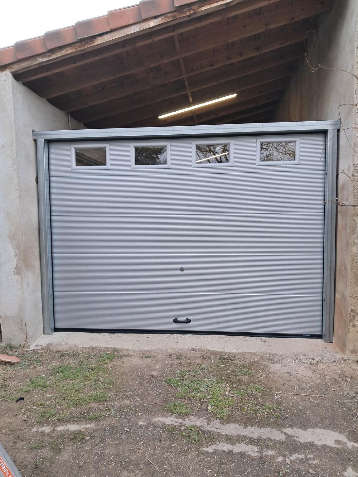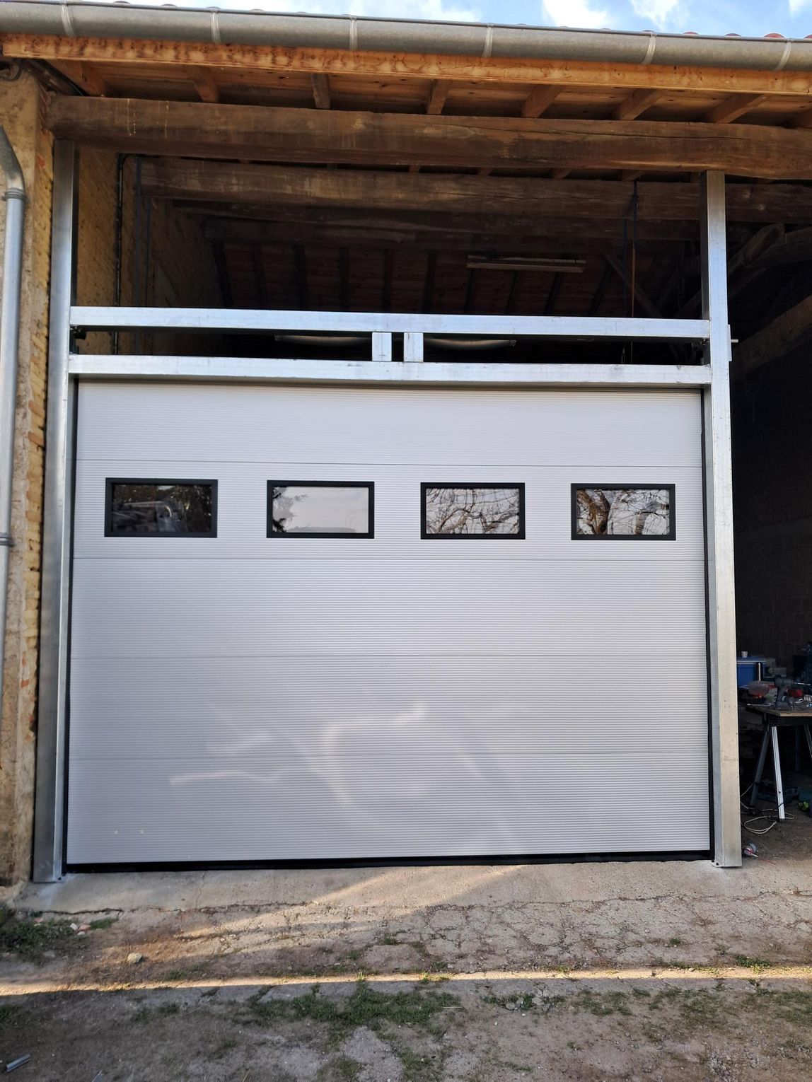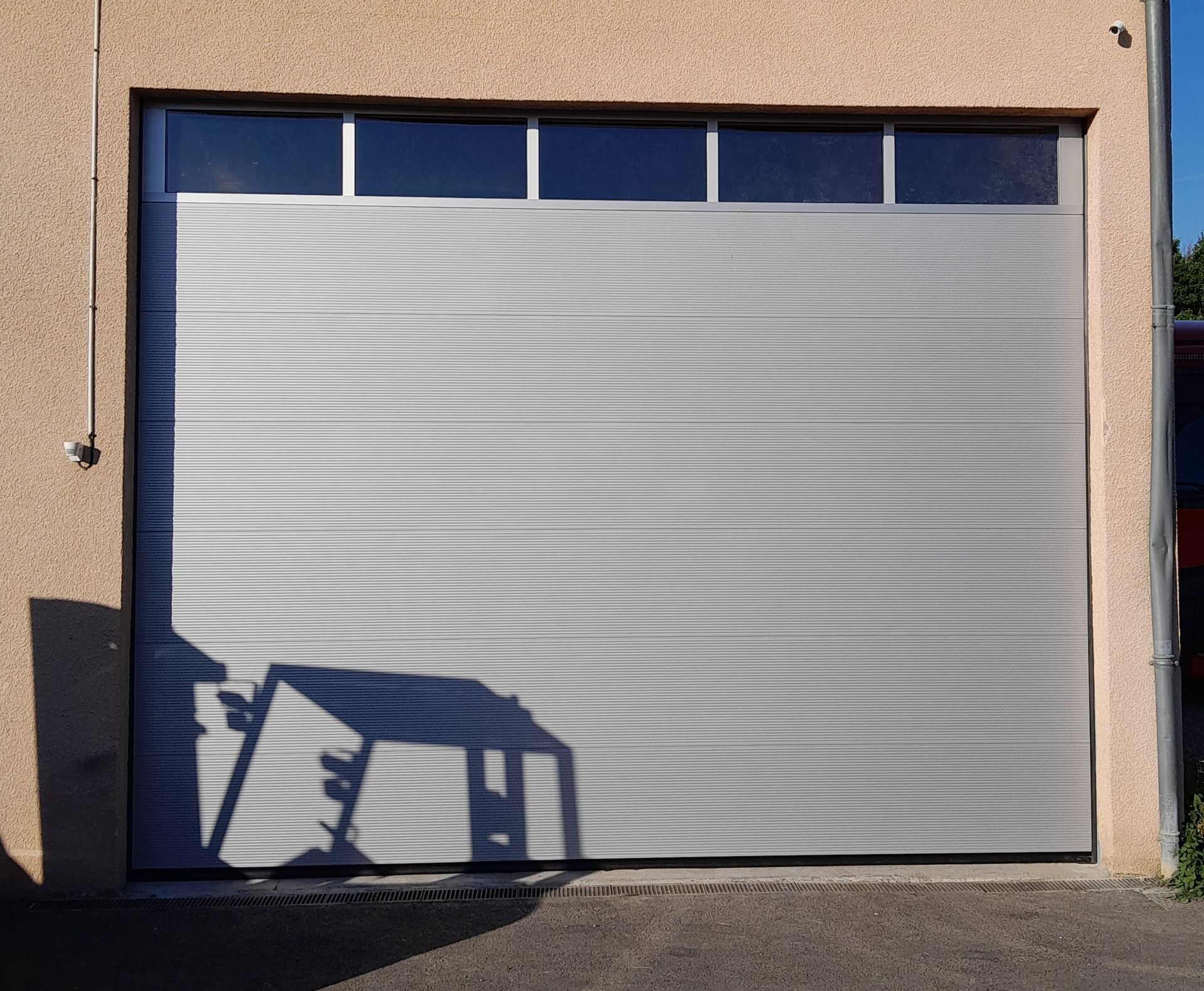 Porte Sectionnelle La Toulousaine avecune rangée de hublots. Ouverture manuelle. Tablier Micro rainurés.