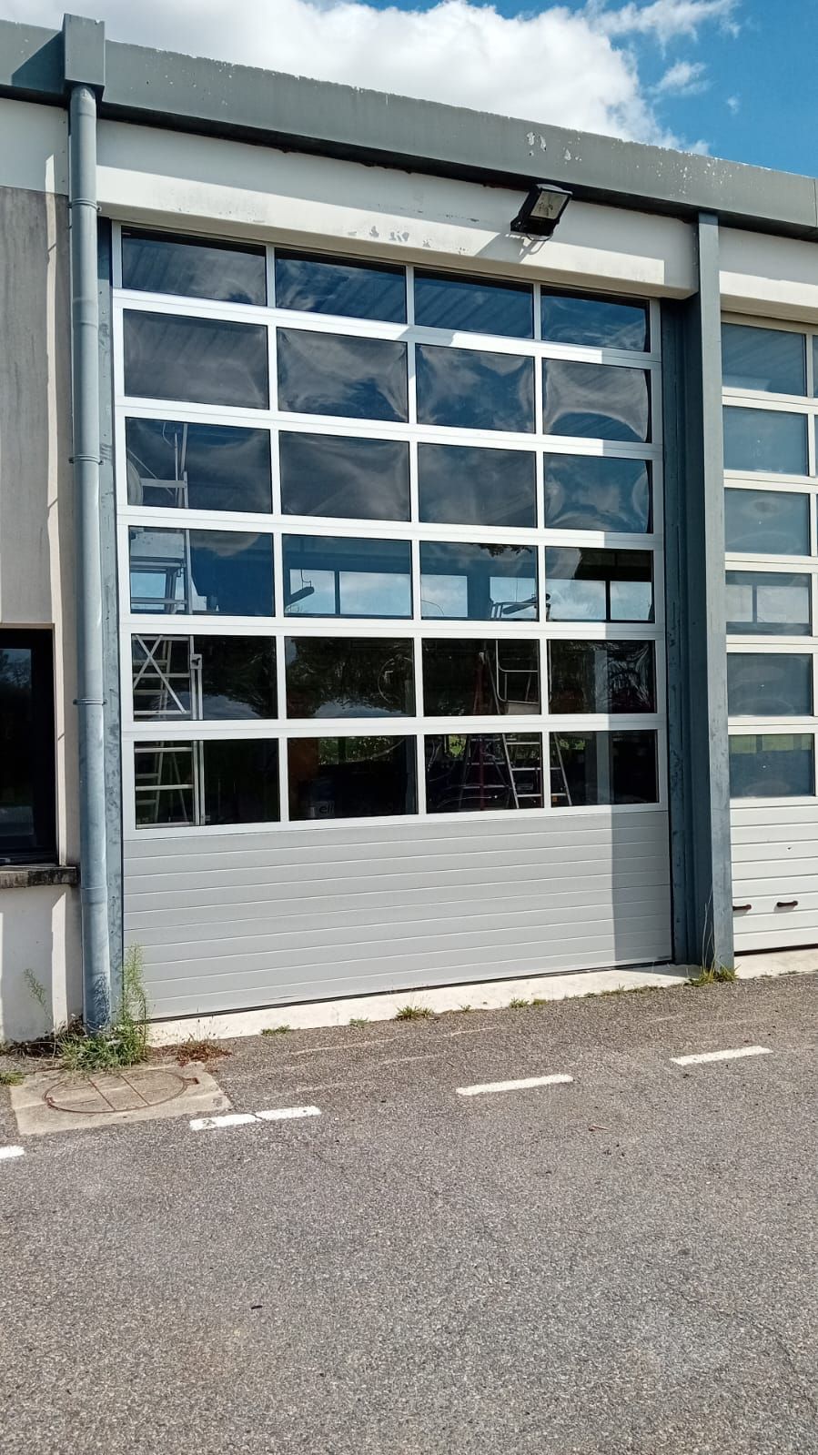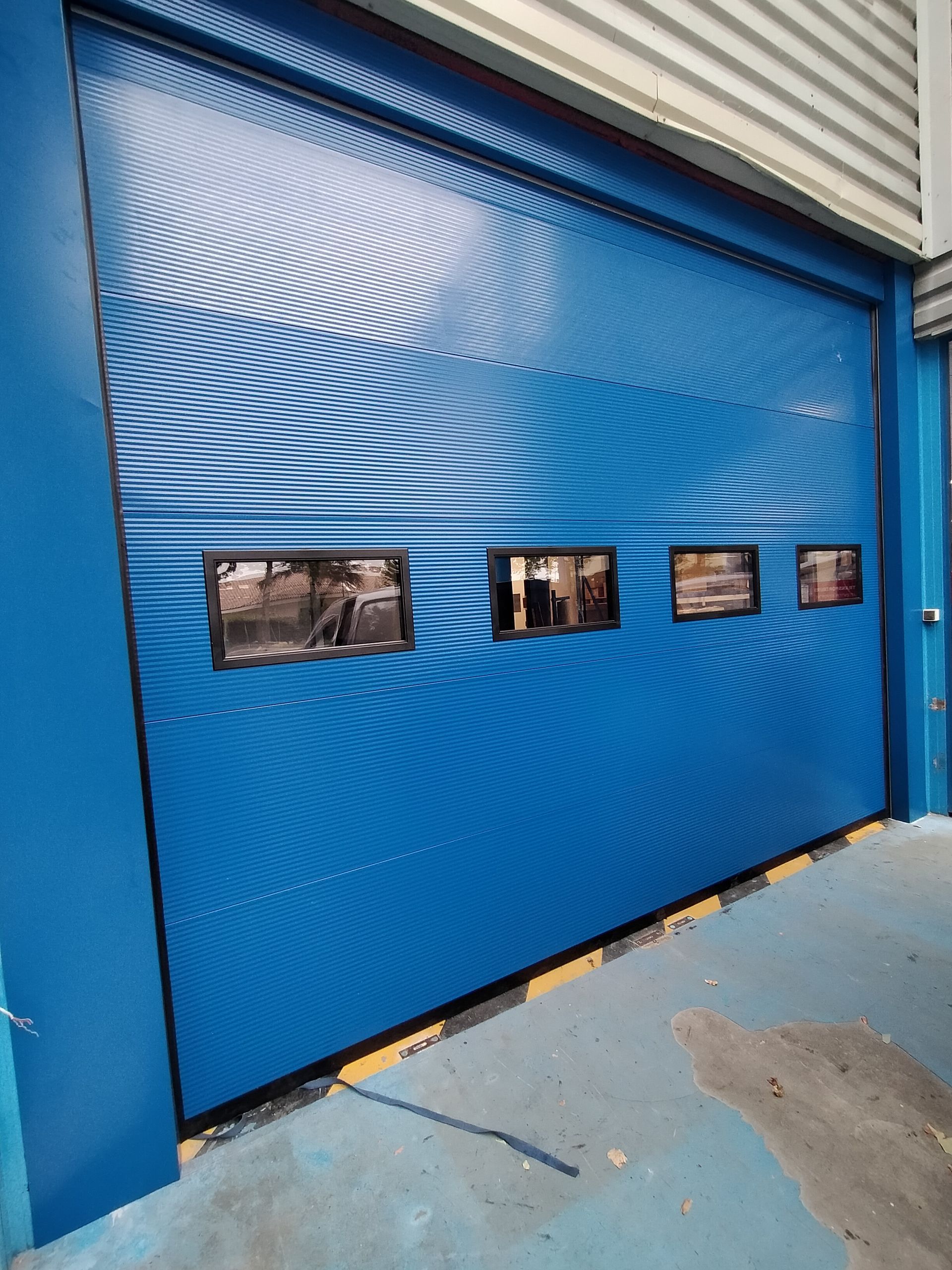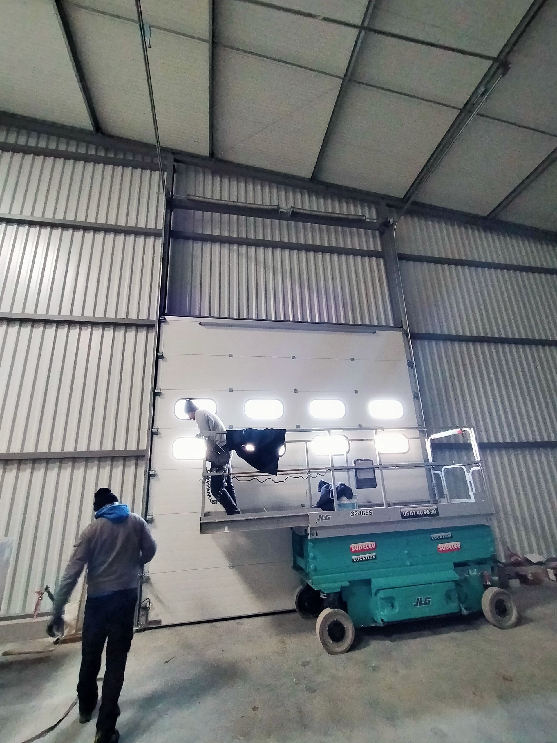 Porte sectionnelle industrielle motorisée avec 1 rangée de hublots. Levée semi verticale.