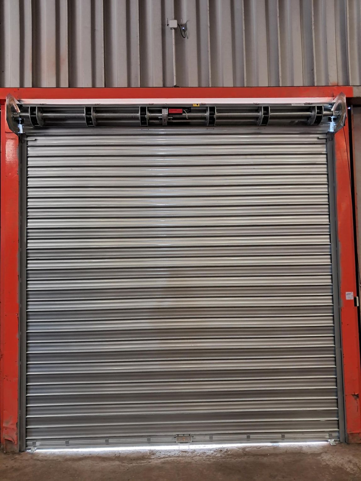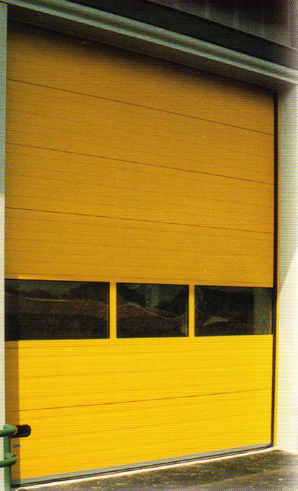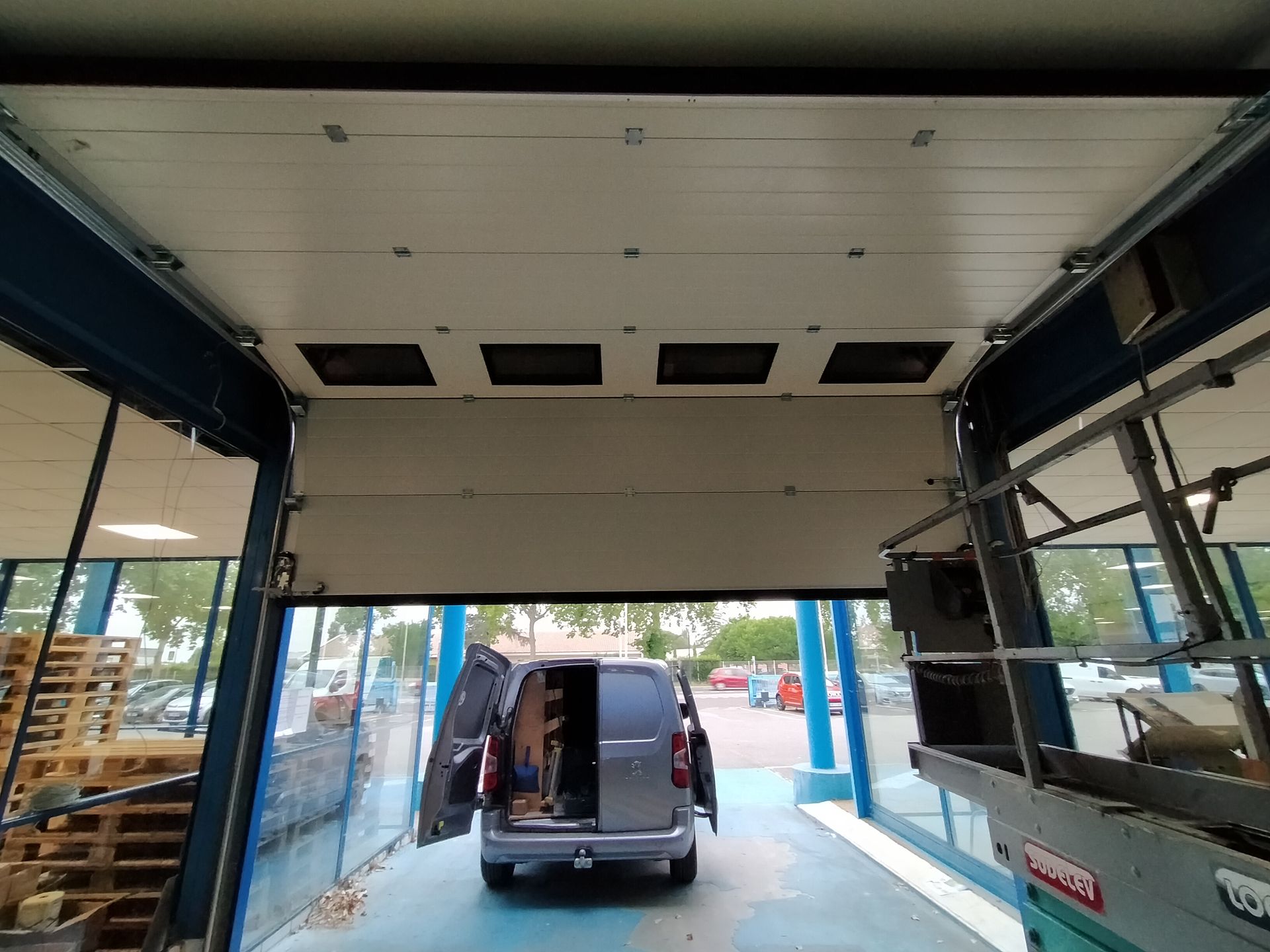 Porte sectionnelle industrielle motorisée avec 1 rangée de hublots. Levée semi verticale.