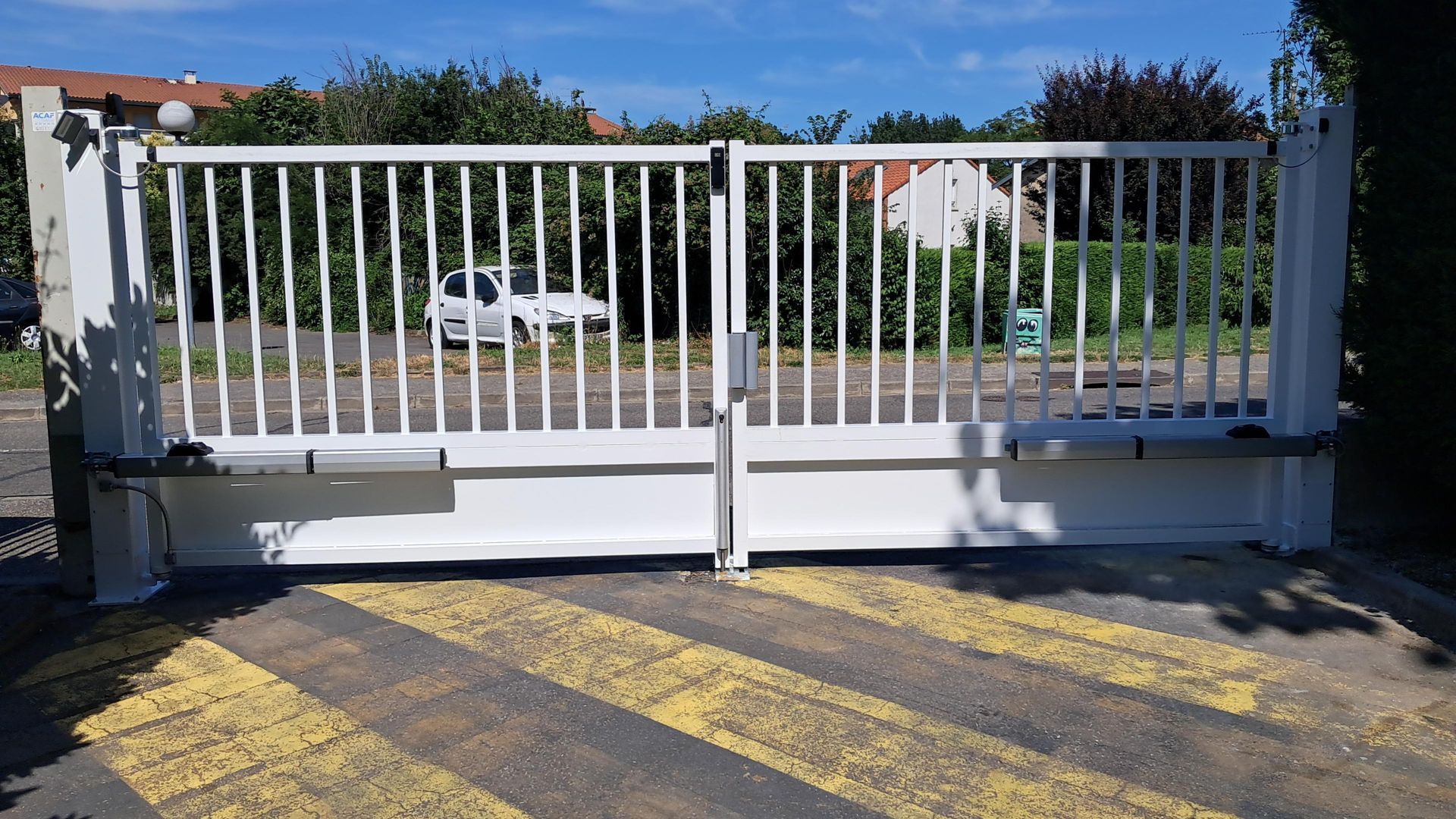 Portail battant pour collectif d'habitation . Motorisation avec vérins hydraulique